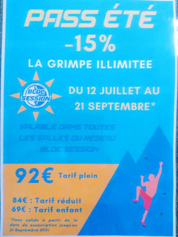 Suite à un partenariat avec bloc session on vous propose le pass'été à 84 euros au lieu de 92 euros jusqu'au 21 septembre